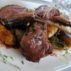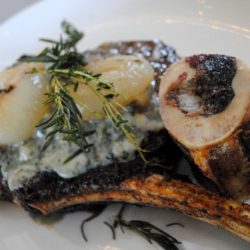 And, for our main courses, we ordered the 24-ounce Cowboy steak, which is a bone-in ribeye, crusted in bleu cheese and the Niman Ranch rack of lamb, that was served with a rhubarb and red wine gastrique with roasted endives and fingerling potatoes.