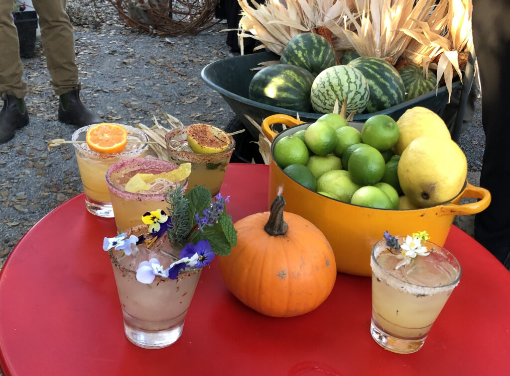 But, back to the citrus. Our group was divided into three teams to gather ingredients for a margarita throwdown, with a little recipe guidance from the bartending staff at Dream Inn. I immediately spied a golden yellow Buddha’s hand about the size of my own that had dropped to the ground, far too heavy for the tree to sustain it. I knew this would be a great addition to the mix. Our team, which included our intrepid magazine editor, Debby Luhrman, made a couple of runs at an ideal margarita, playing with the different rim salts Starr had laid out for us. The winning drink combined Rangpur limes (they look like little oranges – and oh, the flavor!), Lisbon lemons, Eureka lemons, limes, two kinds of oranges, Yuzu and the subtly exotic flavor of Buddha’s hand zest. Plus, I threw in a little anejo tequila and Grand Marnier—others used Triple Sec or Cointreau—to build complexity. That was some drink, and earned us the win, for which we were awarded glowing orange marigold leis made on the farm. We felt so honored!