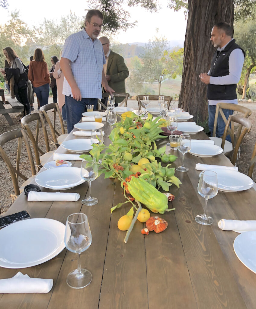 October 18, 2022 – “This is the largest Buddha’s Hand citrus I’ve seen from the farm so far,” marveled Andy Griffin, proprietor of 25-acre Mariquita Farm in Pajaro Valley near Watsonville, as he picked up the massive multi-fingered appendage. It looked like Kermit had mixed it up with an angry green octopus. Said beast was laid out on the dining table, along with a variety of other citrus, flowers, dried corn and mushrooms, comprising the most unusual element of décor assembled for this farm to table dinner. “It must weigh 5 or 6 pounds! I basically rescued the tree from its weight by picking it,” said Griffin, admiring the fruit’s almost frightening bizarreness.