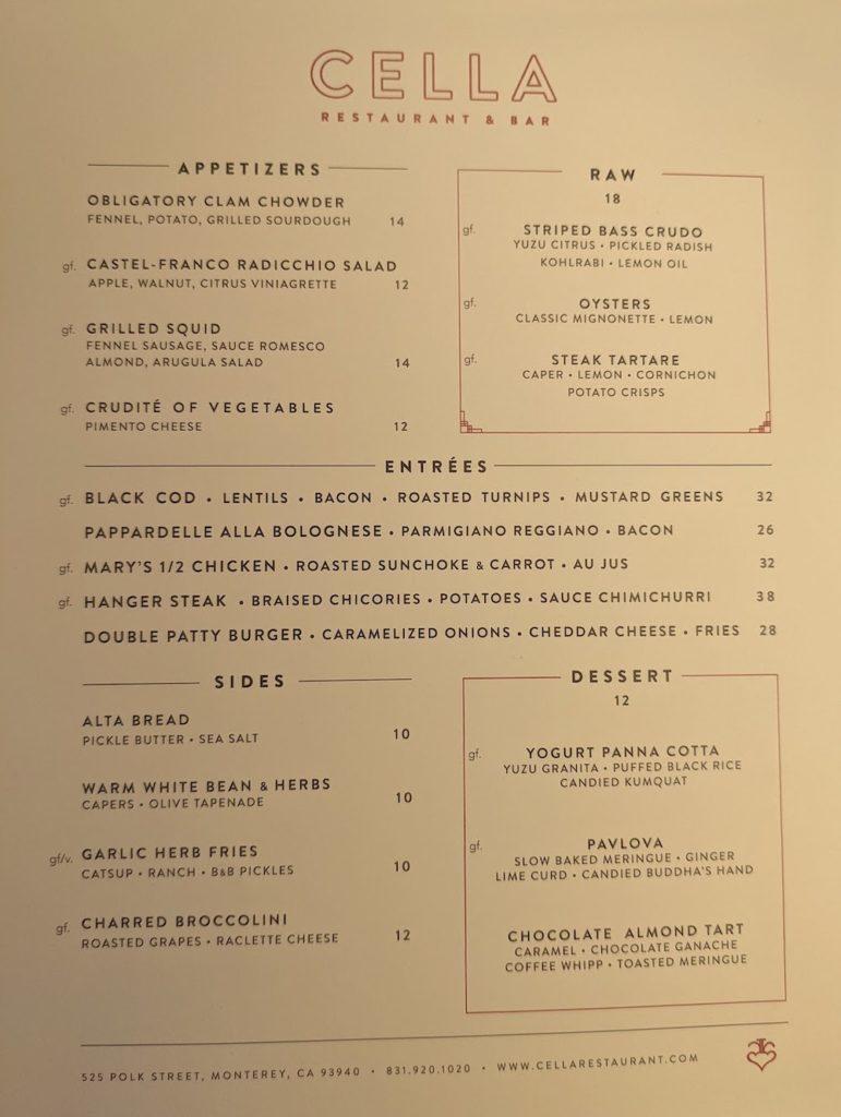 At Cella the menu occupies a single page. It divides between appetizers (like the grilled squid with fennel sausage and Castel-Franco radicchio salad); raw offers (oysters, striped bass crudo and steak tartare); entrees (black cod with lentils and bacon, pappardelle alla Bolognese, Mary’s half chicken with roasted sunchoke and carrot, hanger steak with chimichurri, a signature double-patty burger); sides (Alta bread with pickle butter, warm white beans, garlic herb fries, charred broccolini); and desserts (yogurt panna cotta, pavlova, chocolate almond tart).