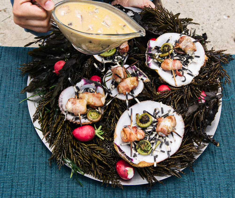 Drawing inspiration from star free diver Kimi’s Werner’s catch-and-cook YouTube channel, Valdivieso made it her own by using what she had available in her garden, making her own cast iron bread, crafting kombucha kelp pickles, and adding uni to the sauce. (After seeing uni pasta sauces online, she thought, Why can’t this umami go in an aioli?) Then she brainstormed what locally occurring product would make a good accompaniment.