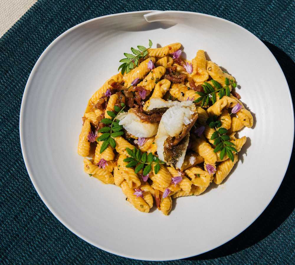 Cavatelli Carbonara in Roast Red Pepper Puree with Rockfish Crispy Fried Scales