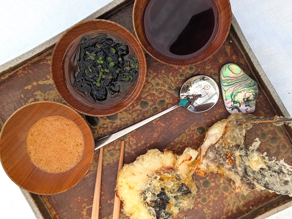 For a dish the event judges nearly scored perfect, he intended to spear a monkeyface prickleback and prepare it like an eel might be prepared in Japan. He ended up with black rockfish, and nailed the cloud-like tempura preparation, but it was the sauces that really captured appetite and imagination. He crafted a traditional tentsuyu sauce made from the rockfish bones, confit of wild nori with wild spring onion, and a purple sea urchin and lime sauce.