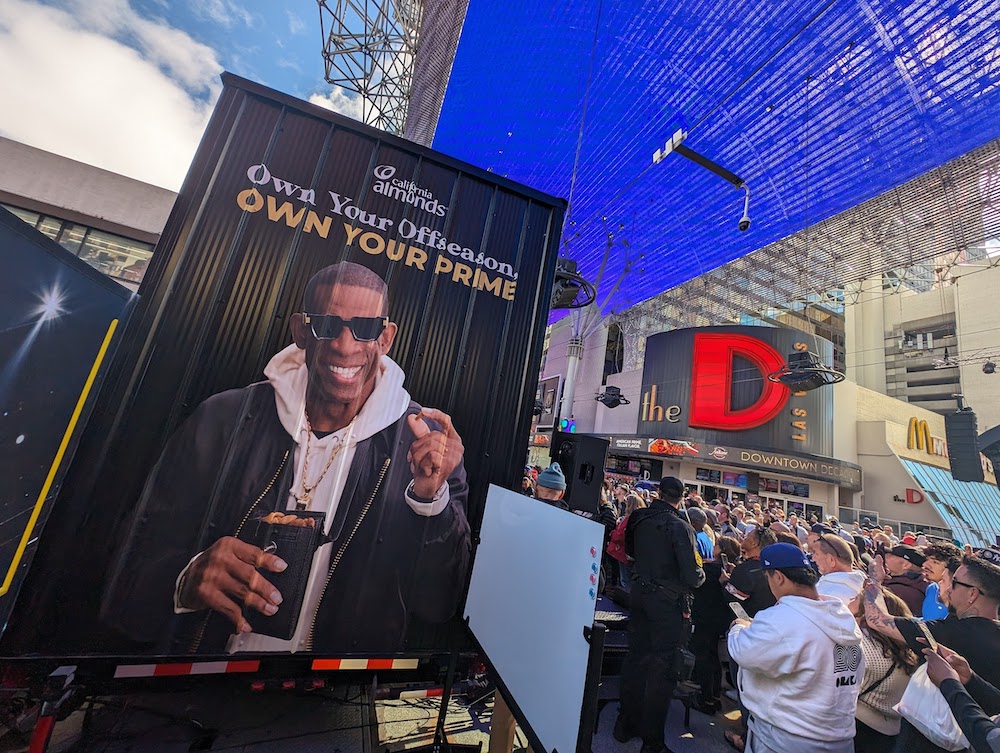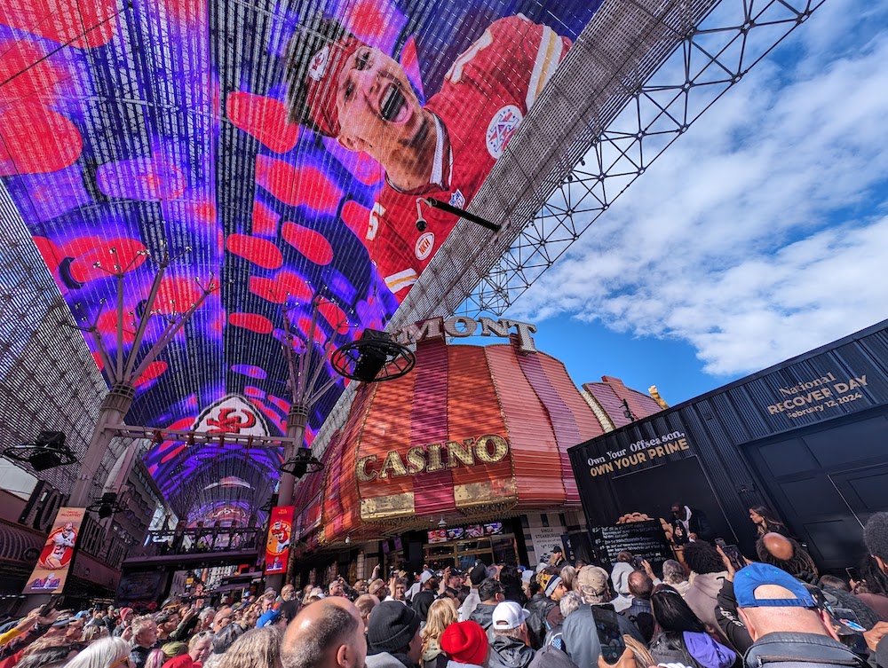 It’s noon thirty on a pre-Super Bowl Thursday and a crowd has gathered on downtown Las Vegas’ Fremont Street amidst all its 360-degree stimulation.