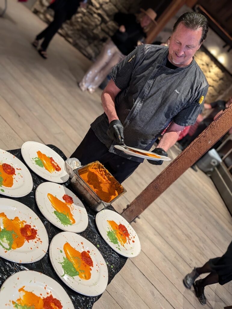 At the Dalí Dinner he was clearly in his element, making “eyeballs” out of salmon mousse, splattering sauces like paint, doing a bone-in Wellington inspired by “Celestial Elephant,” and keeping the prep and service team loose.