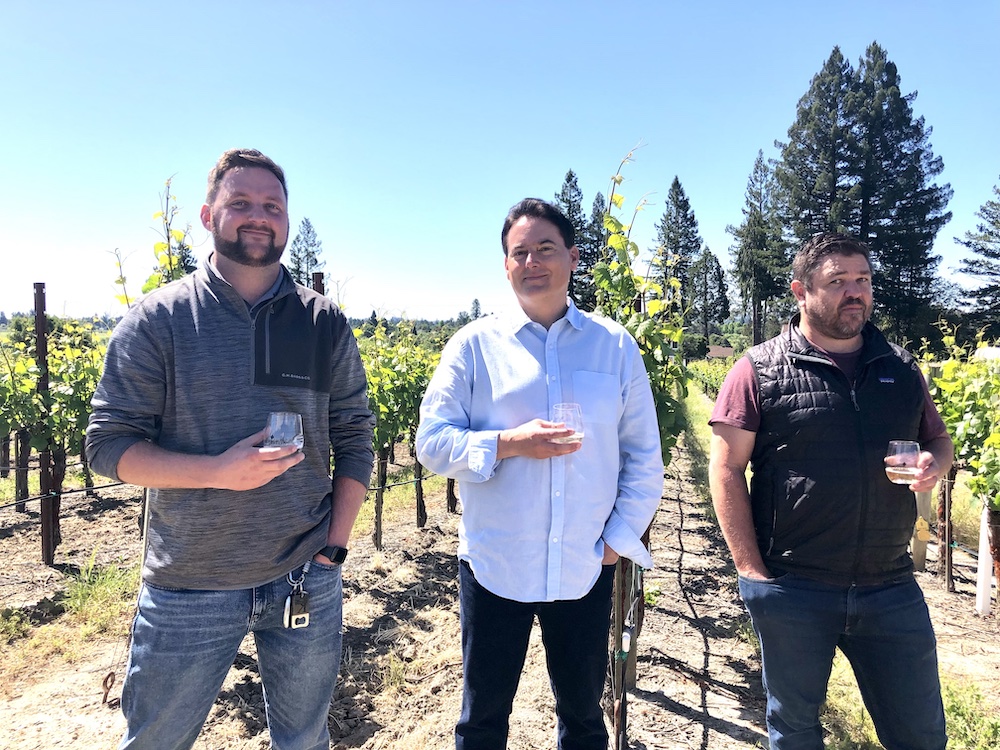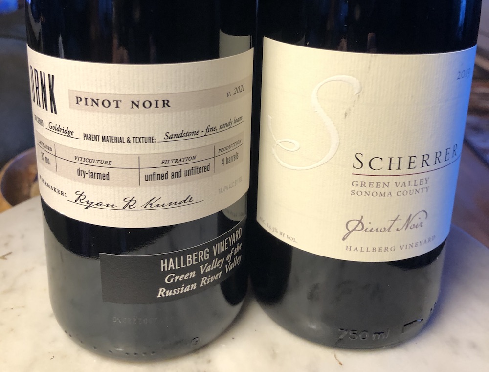 Earlier this year, I had the great privilege to taste a set of Russian River Pinot Noirs from the Hallberg Ranch Vineyard at Emeritus Vineyards, just northeast of Sebastopol, right at the very eastern edge of the Green Valley AVA of Sonoma. It’s definitely on the warmer side of Green Valley. Although it does get some fog, it’s for sure not in the chill zone of the westernmost reaches that are closer to the ocean. The temperature swings at Hallberg Ranch can be up to 50 degrees, which tells you it can get mighty hot there, as it was the day we visited in May this year. No sweaters, jackets etc. needed. Hats were a good idea.