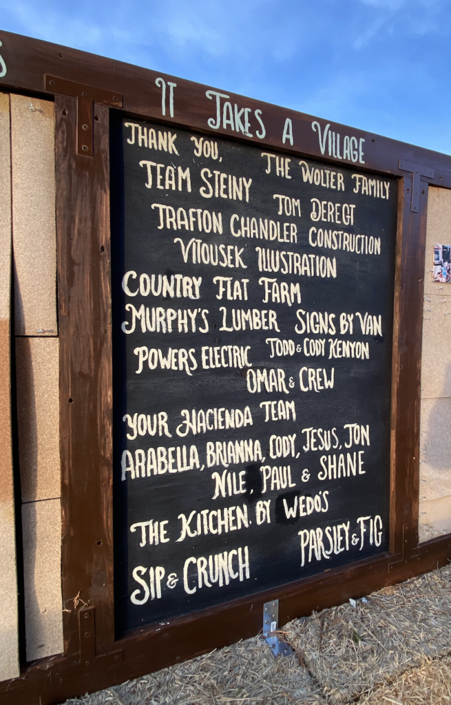 The back of a welcoming sign gets at the depth of collaboration, listing a range of construction, realty and community souls who pitched in.