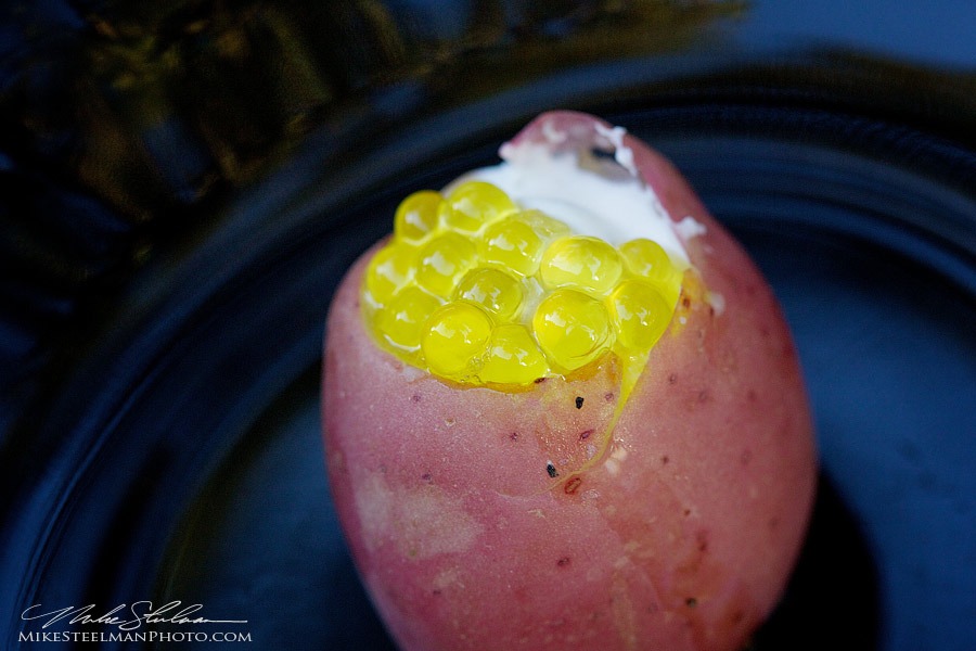 The surprises began with an amuse bouche of “Vegan Caviar,” aka olive oil caviar, an Italian import marketed under the name Caviarolio. The golden beads have the pop of real fish eggs and deliver a drizzle of extra virgin olive oil over whatever they are served with, in this case, tiny Carmel Valley new potatoes.