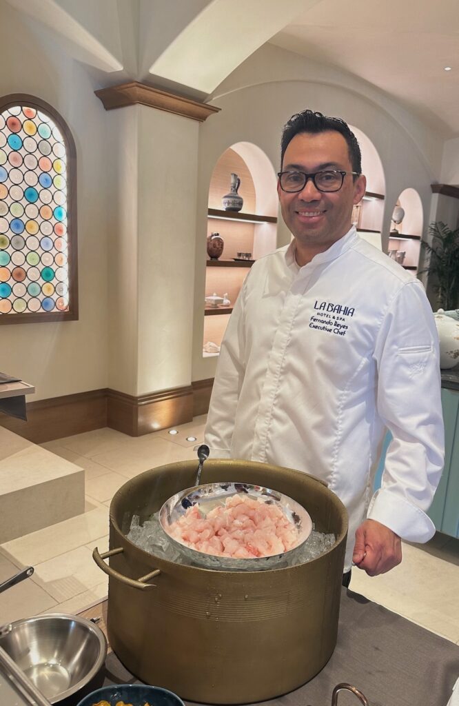 He has created four distinct culinary concepts at La Bahia and some of the menus have already been posted. Plunge poolside dining includes shrimp aguachile and ceviche along with smash burgers and garlic-Parmesan fries. The London-style Pearl cocktail bar offers potato pave with caviar ($25) and smoked Scottish salmon tartare cones ($12).