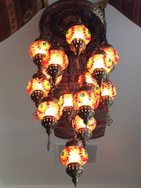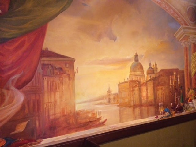 There are Turkish textiles on the walls in the entry way, lending warmth, and the space is lit by an exotic handblown chandelier that gives off a kaleidoscope of colored light. New pendant lights over the long bar look like ancient Greek mosaics and newly painted murals on the walls show views of Greek temples and the Grand Canal of Venice.