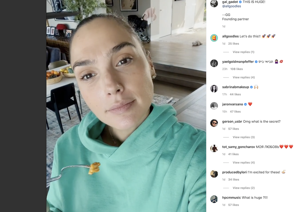 While many details are still under wraps pending the official product launch November 16, Gadot posted a teaser video to her 66 million Instagram followers Monday that shows her eating a forkful of mac ‘n cheese and promising something huge.