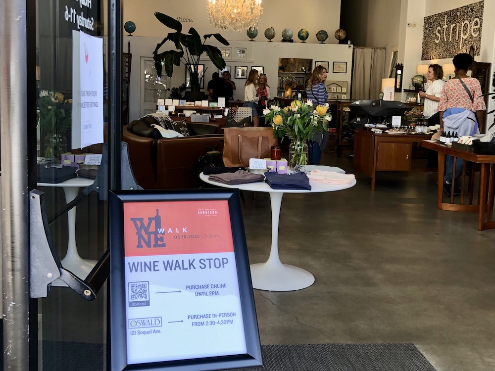 May 20, 2025 – It was heartening to see the mostly very young crowd, including many UCSC students, enjoying Santa Cruz Mountains wines on a brilliant day in downtown Santa Cruz. With nearly 300 tickets sold, traffic was robust and kept my friend Katarina and me on our toes as we poured Kings Mountain Vineyards new 2024 Boathouse Rosé of Pinot Noir, made by winemaker Nathan Kandler of Thomas Fogarty Winery. As people streamed into Stripe the Store, admiring the eclectic merchandise that includes everything from cool martini glasses, world globes, fancy pillows and brass dachshunds meant for mantle decor, we were delighted by the youthful nature and open-mindedness of the tasters.