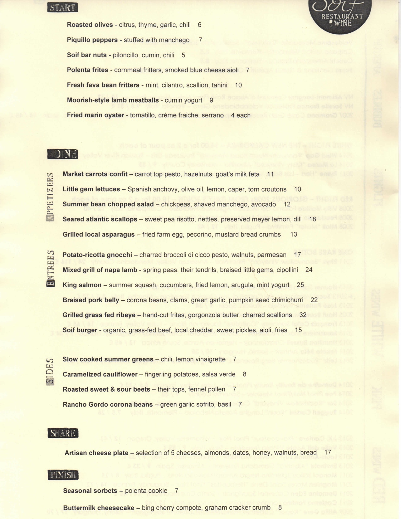 Other new dishes on the seasonal menu include: polenta frites with smoked blue cheese aioli; fava bean fritters with mint, cilantro, scallion and tahini; and seared Atlantic scallops with sweet pea risotto, nettles, preserved Meyer lemon and dill. View partial menu below.