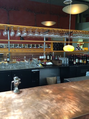 The former bottle shop has been converted into a long bar area with a gleaming copper counter that overlooks the dining room. The retail area has been moved into a larger space next door, where there is more room to display bottles and hold events.