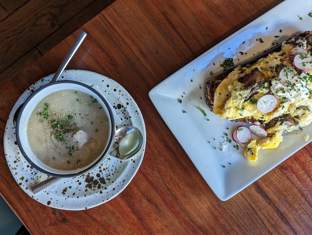 The wild mushroom tartine qualifies as crazy good, particularly with swordfish “bacon” added (you can also include avocado). The swirl of textures—meaty mushrooms, soft scrambled eggs, toasty-crunchy Ad Astra bread, crisp radish, fresh chives and toothy smoked slices of swordfish—harmonizes with the earthy chanterelles and smoky swordfish.