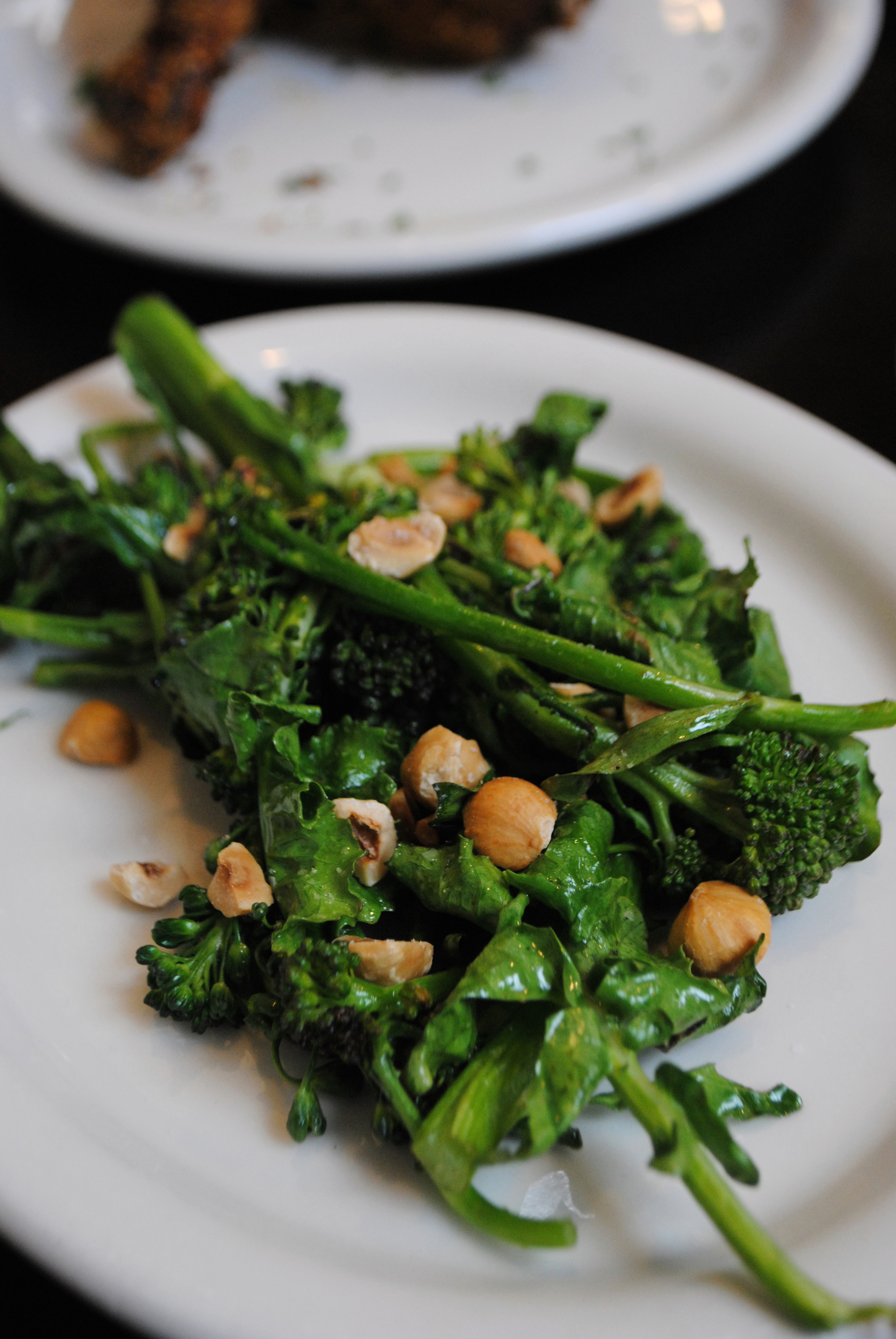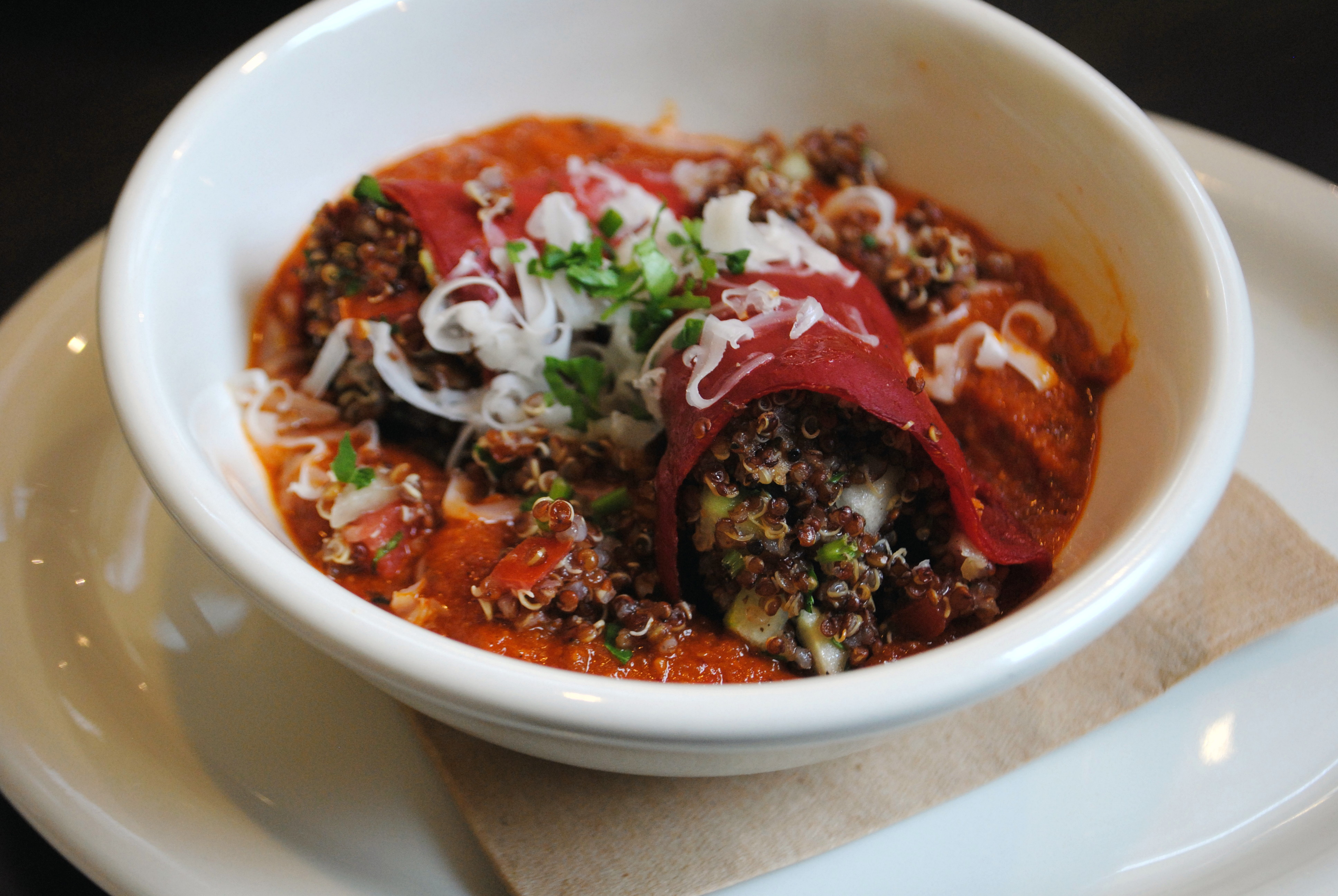 We feasted on the best oven-baked chicken I’ve ever had. The buttermilk-marinated Mary’s organic chicken (4 drumsticks per platter at $13) was tender and juicy; the outside crust was crisped and intriguingly spiced. Piquillos (2 peppers in the bowl for $10)—diminutive, sweet peppers—were roasted and stuffed with red quinoa, cucumbers, tomatoes, and herbs.