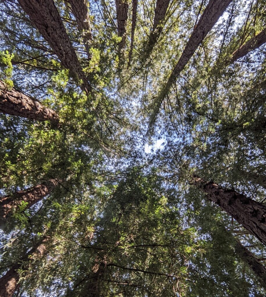 Sun was prisming through a tight grove of nearby redwoods when I realized it was a fairy ring—the circle of soaring trees that sprout from the roots of the fallen redwood.