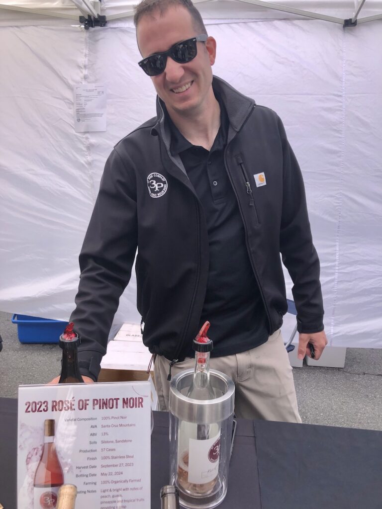 Local wineries were well-represented, with Dan Petrocchi of 3P Wines pouring a bright and cheery 2023 Pinot Noir rosé, Fogarty Winery pouring their very agreeable Santa Cruz Mountains Pinot Noir, and Eric Baugher and Shun Ishikubo of Deaurātus, were pouring their Grenache Blanc from Michael Michaud’s vineyard in Chalone, their new Gali Vineyard Chardonnay, a Zinfandel from Dry Creek and a Cabernet from Paso. These handsome lads were stationed next to Steven Kent Winery from Livermore, where Steven Mirassou and his wife Beth, regaled people with all manner of Cabernet Franc, from including red and blanc. The energy was electric in this tent.