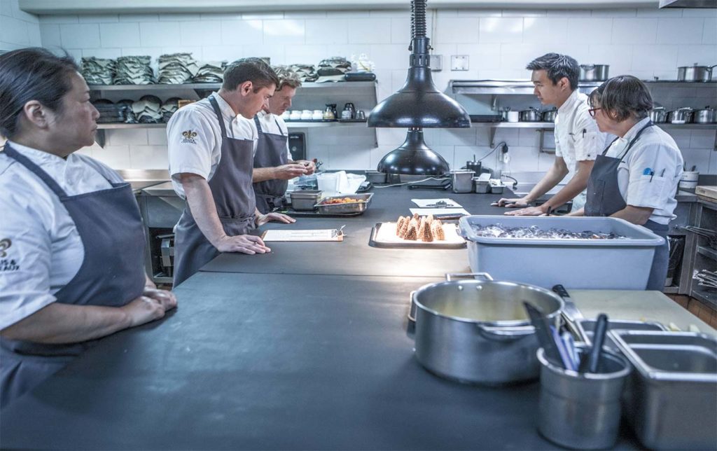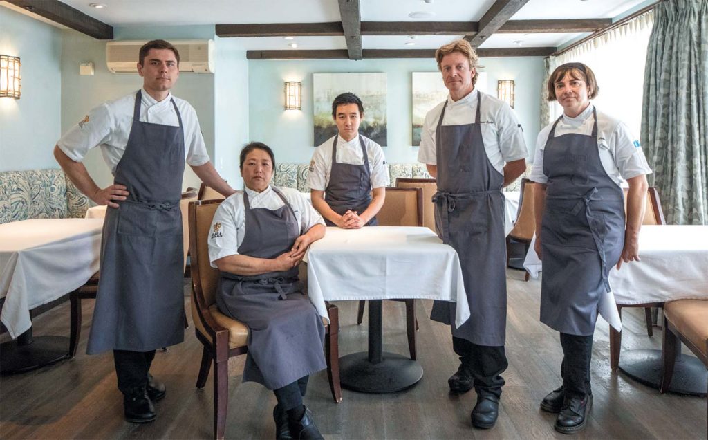 The Aubergine team includes (l-to-r) Trevor Mathiak, sous chef; Yulanda Santos, executive pastry chef; Ki Chung, chef de cuisine; Justin Cogley, executive chef-director; and Diana Phipps, pastry chef and garde assistant