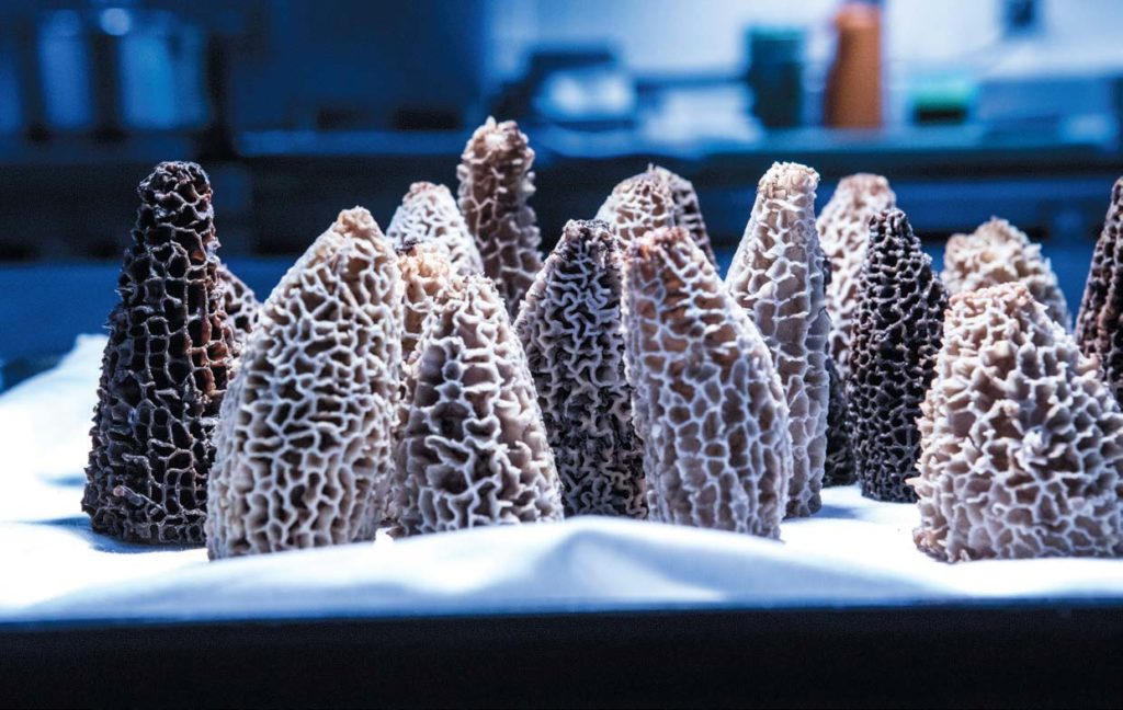 A tray of morel mushrooms await the deft hands of Aubergine chefs.
