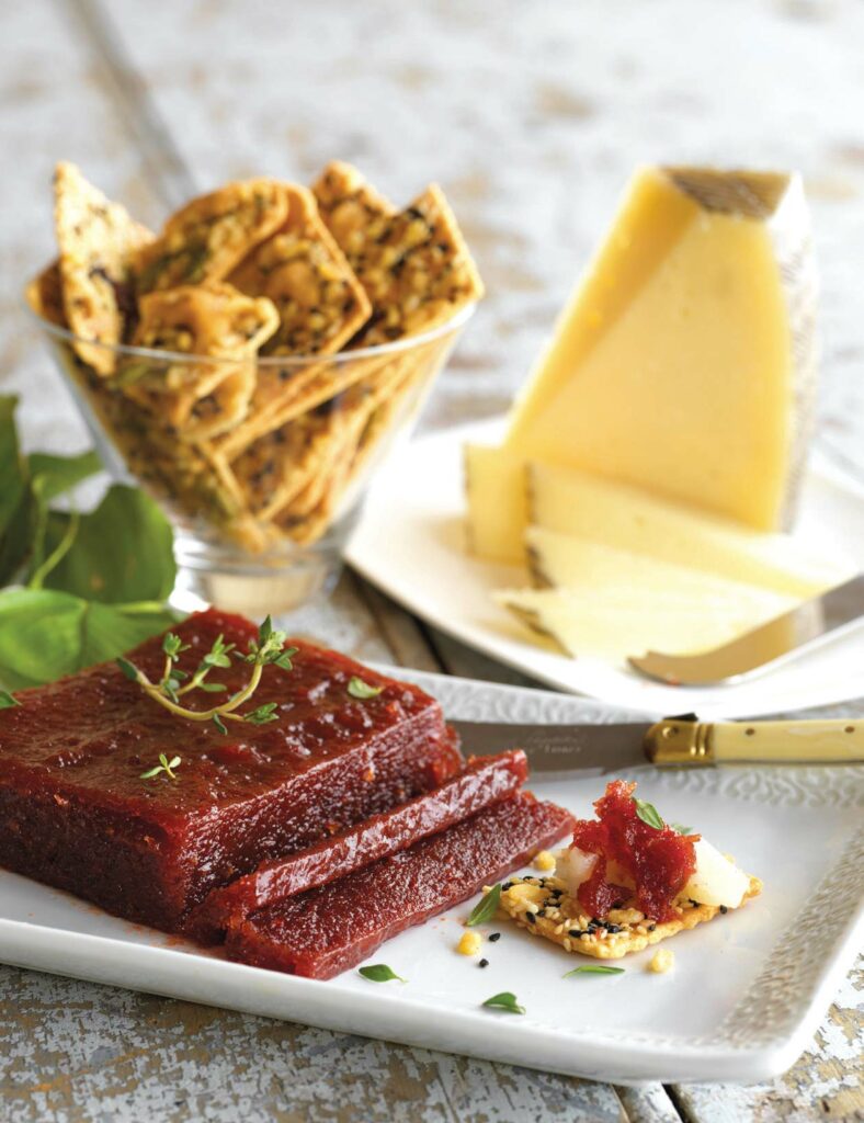 Membrillo keeps for over a month refrigerated, pairs well with any cheese and is a wonderful accompaniment to cured meats. Although most recipes usually call for just quince, sugar and lemon juice, I like to add a blend of spices to augment the flavor. You may be tempted to reduce the considerable amount of sugar in the recipe, which will yield a membrillo with a softer texture that, while not sliceable, is still quite tasty.
