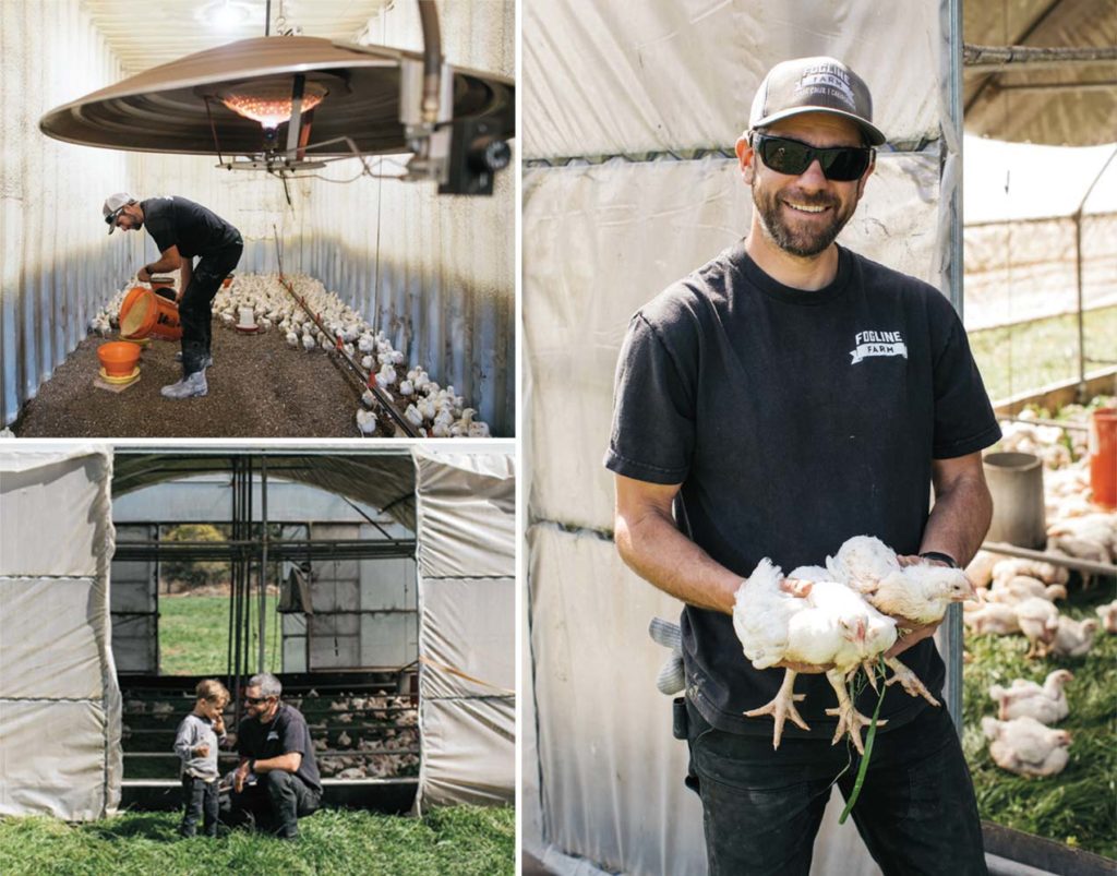 Fogline Farm was started in 2009 by a trio of graduates from the Center for Agroecology at UC Santa Cruz and is named for the place it began in the Soquel hills. Today, the operation is led exclusively by Caleb Barron and is staffed by five full- and 10 part-time crew members, who tend the flocks, butcher and pack meat, organize the warehouse and travel to weekly farmers’ markets from Oakland to Monterey. On a calm day, Barron can hear elephant seals while working at his open-air picnic table desk. He is chicken guardian in chief; president of operations and brood manager charged with feeding, observing and caring for his flock at every stage of their sixweek life cycle.
