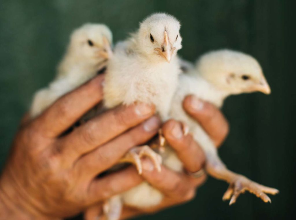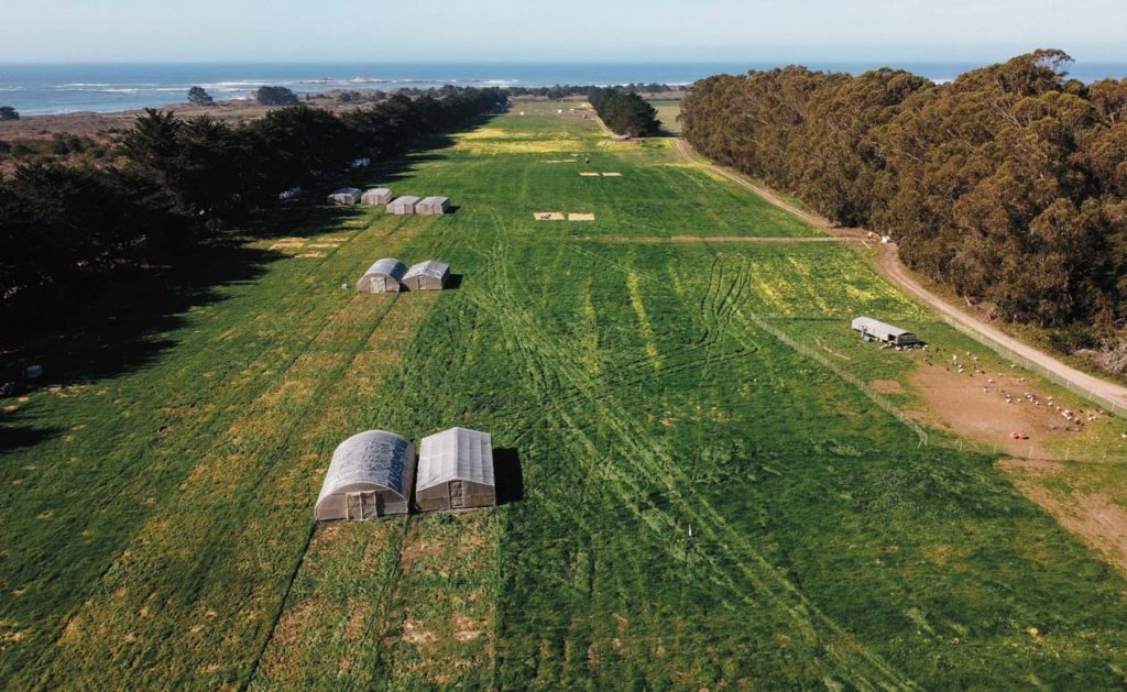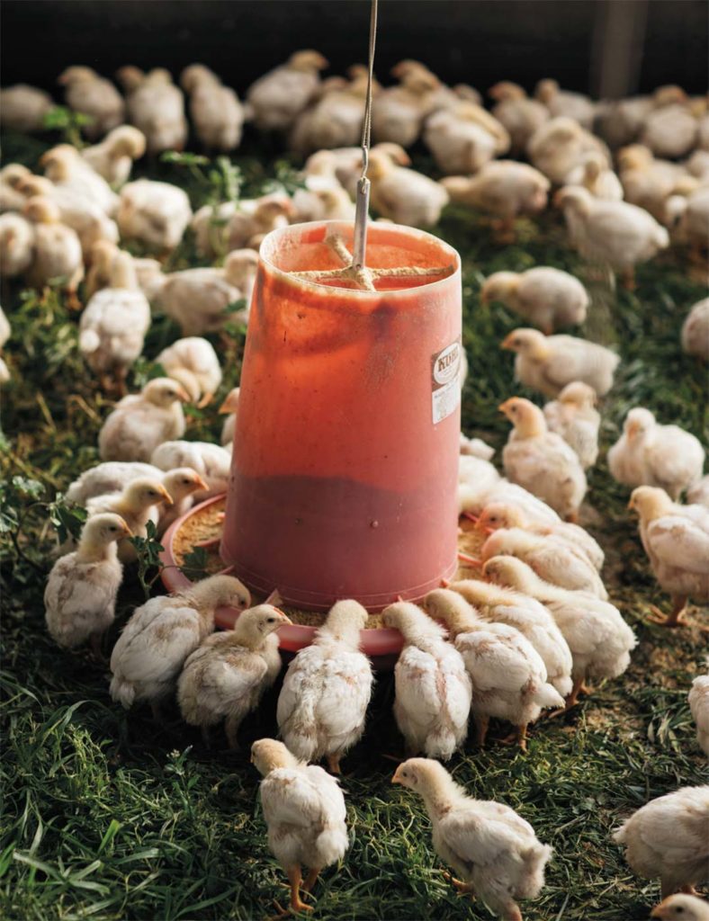 The chilly morning I visited, sparrows twittered in the clutches of a spindly apple tree in front of a row of dark green shipping containers that are used as brooders. Inside one of the repurposed containers, hundreds of week-old chicks huddled around poultry feeders, warmed by overhead gas heaters and a cozy layer of peat moss underfoot. Beyond the brooders, an emerald sea of tangled pastures extends out to the horizon, eventually meeting sand dunes that undulate to the Pacific.
