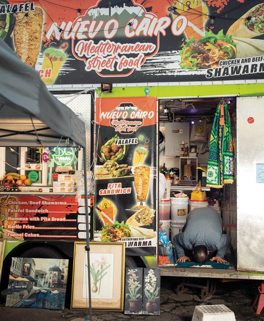 Framed prints of a gondola ride in Venice and amaryllis flowers lean against the bottom of the truck, while an outside shelf offers small plastic containers of baba ghanoush, hummus, baklava, toasted sesame and sugar bars and Medjool dates. If you look a little closer, you will even see stacks of paperback copies of the Koran for sale.