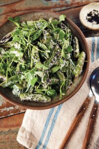 Seafood and foraged ingredients are a big part of the fare—from the melted anchovy sauce on his charred broccolini to the Japanese-inspired Seaweed-Shiitake Miso Soup. He also makes liberal use of Meyer lemons throughout the 130 recipes, like the roasted snap pea salad (see recipe below).